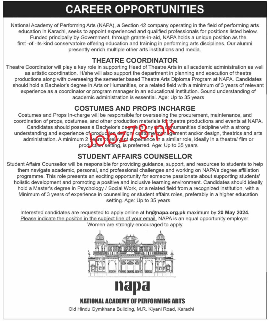Candidates if you are seeking National Academy of Performing Arts (NAPA) Jobs May 2024 if yes. then you should try to complete this National Academy of Performing Arts job because here you can easily apply for these vacancies Theatre Coordinator, Student Affairs Counsellor, And Consumers And Props Incharge.
