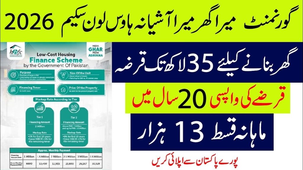 میرا گھر میرا آشیانہ سکیم 2026 پاکستان میں کم اور متوسط آمدنی والے خاندانوں کے لیے سستی رہائشوں کو قابل رسائی بنانے کے لیے حکومت کا ایک بڑا قدم ہے۔ جائیداد کی قیمتوں میں مسلسل اضافہ کے ساتھ، بہت سے پہلی بار خریداروں نے اپنے گھر خریدنے کے لیے جدوجہد کی ہے۔ یہ اسکیم سبسڈی والےقرضے، مقررہ شرح سود، اور آسان ماہانہ اقساط کے منصوبے مہیا کرتی ہے، جس سے گھر کی ملکیت کا خواب حقیقت میں بدل جاتا ہے۔ میرا گھر میرا آشیانہ سکیم 2026 خاص طور پر پہلی بار گھر خریدنے والوں کے لیے ڈیزائن کیا گیا ہے جنہیں گھر کی خریدارییا تعمیر کرتے وقت مالی رکاوٹوں کا سامنا کرنا پڑتا ہے۔ یہ پروگرام افراد کو 5 مرلہ کا گھر خریدنے، اپنی زمین پر تعمیر کرنے یا 1,360 مربع فٹ تک کا فلیٹ خریدنے کی اجازت دیتا ہے۔ کم سود والے قرضوں اور طویل مدتی ادائیگی کے اختیارات پیش کر کے، یہاقدام پاکستان بھر میں ہزاروں خاندانوں کے لیے گھر کی ملکیت کو عملی اور سستی بناتا ہے۔ میرا گھر میرا آشیانہ سکیم 2026 کی اہم خصوصیات ہدف سے فائدہ اٹھانے والے کم اور درمیانی آمدنی والے گھرانوں سے پہلی بار گھر خریدنے والے۔پراپرٹی کے سائز کی حدود مکان کا سائز: 5 مرلہ تک۔ فلیٹ سائز: 1,360 مربع فٹ تک قرض کی رقم اور شرح سود زیادہ سے زیادہ قرض: روپے 3.5 ملین ٹائر 1: روپے تک کے قرضوں پر 5% مقررہ سود۔ 2 ملینٹائر 2: روپے تک کے قرضوں پر 8% مقررہ سود۔ 3.5 ملین لچکدار مدت اور آسان اقساط قرض کی مدت 20 سال تک۔ پہلے 10 سالوں کے لیے سرکاری سبسڈی دستیاب ہے۔ کم سے کم ایکویٹی اور زیرو پوشیدہ چارجز ایکویٹی: جائیداد کی قیمت کا صرف 10٪۔ جلد ادائیگی کے لیے کوئی پروسیسنگ فیس یا جرمانہ نہیں۔ میرا گھر میرا آشیانہ سکیم 2026 کے لیے اہلیت کا معیاراسکیم کے لیے اہل ہونے کے لیے، درخواست دہندگان کو: اور وظیفہ کی تفصیلات ایک درست CNIC کے ساتھ پاکستانی شہری بنیں۔ پاکستان میں کسی گھر یا فلیٹ کا مالک نہیں۔ آمدنی اور ادائیگی کی صلاحیت کا ثبوت دکھائیں۔تعمیر یا خریداری کے لیے جائیداد کی صاف دستاویزات رکھیں۔ اسکیم کے تحت مقرر کردہ قرض کی رقم اور جائیداد کے سائز کی حد کو پورا کریں۔ میرا گھر میرا آشیانہ سکیم 2026 کے لیے اپلائی کیسے کریں۔مرحلہ وار درخواست کا عمل اپنی اہلیت چیک کریں: یقینی بنائیں کہ آپ اہلیت کے معیار میں درج تمام تقاضوں کو پورا کرتے ہیں۔ حصہ لینے والے بینک کا انتخاب کریں: کسی بھی کمرشل بینک، اسلامی بینک، یا مائیکرو فنانس بینک پر جائیں جو اسکیمپیش کرے۔ درخواست جمع کروائیں: ہاؤسنگ فنانس فارم پُر کریں اور تمام مطلوبہ دستاویزات منسلک کریں، بشمول CNIC، آمدنی کا ثبوت، جائیداد کے کاغذات، اور تصاویر۔ قرض کی منظوری اور تقسیم:منظوری کے بعد، آپ ایکویٹی رقم جمع کرائیں گے، اور بینک آپ کے گھر کے لیے قرض جاری کرے گا۔ میرا گھر میرا آشیانہ سکیم 2026 کے فوائد کم آمدنی والے خاندانوں کے لیے سستی رہائش۔ کرایہ پر انحصار کو کم کرتا ہے اور طویل مدتی مالی تحفظ فراہم کرتا ہے۔ ماحول دوست اور سستی تعمیر کی حوصلہ افزائی کرتا ہے۔ ہاؤسنگ سیکٹر میں معاشی نمو اور روزگار کے مواقع پیدا کرنے میں مدد کرتا ہے۔ میرا گھر میرا آشیانہ سکیم 2026 کیوں منتخب کریں۔آسان فنانسنگ کے اختیارات کم سود کی شرح، لچکدار ادائیگی، اور صفر پوشیدہ چارجز اس اسکیم کو پہلی بار خریداروں کے لیے مثالی بناتے ہیں۔ حکومتی تعاون یہ اسکیم حکومت کی حمایت یافتہ ہے، جو درخواست دہندگان کے لیے شفافیت اور مالی تحفظ کو یقینی بناتی ہے۔ طویل مدتی استحکام 20 سال تک کی مدت کے ساتھ، خاندان اعتماد کے ساتھ اپنے مالی مستقبل کی منصوبہ بندی کر سکتے ہیں۔ اکثر پوچھے گئے سوالات – میرا گھر میرا آشیانہ سکیم2026 میرا گھر میرا آشیانہ سکیم کے لیے کون درخواست دے سکتا ہے؟ کوئی بھی پاکستانی شہری جس کے پاس پہلے سے گھر یا فلیٹ نہیں ہے وہ اہل ہے۔قرض کی زیادہ سے زیادہ رقم کیا ہے؟ دستیاب قرضہ زیادہ سے زیادہ روپے ہے۔ ٹائر 2 کے تحت 3.5 ملین۔ کیا میں اپنی زمین پر تعمیر کر سکتا ہوں؟ جی ہاں، اسکیم نئے گھر کی خریداری اور ملکیتی پلاٹو